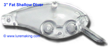 SHALLOW FAT DIVERS Our high quality clear unglued fat diver bodies are made to our high standards. Each body comes in two halves ready for customizing. Just insert the required figure "8" forms and optional rattle beads then glue using ABS Cement, ABS/PVC Transition Cement, MEK or Testors plastic cement and paint as desired. Customize the baits by painting your own custom colours and patterns, or insert prism tape and leave bait clear for interesting effects. 3" Fat Shallow Diver