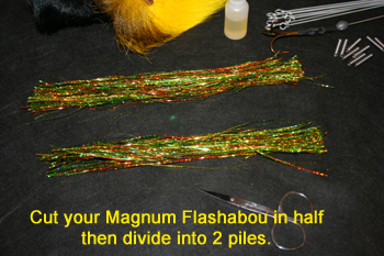 pile. The flashabou should now be approximately 10 inches long. Now divide the pile into two new piles with approximately 2/3rds going to